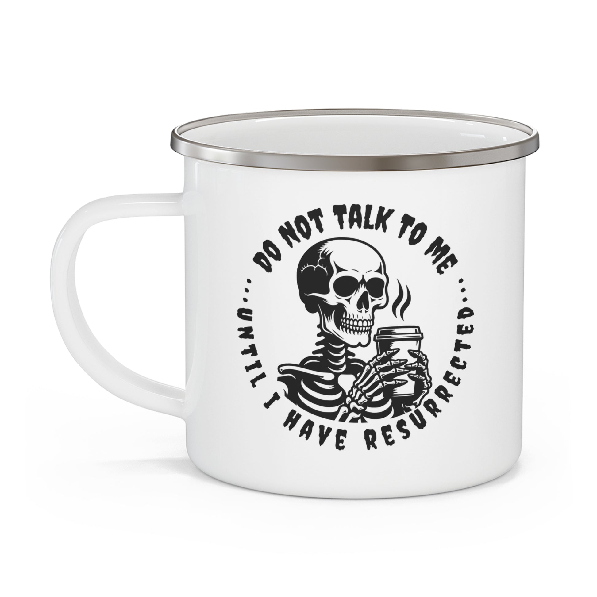 Bring some undead humor to your morning brew with the Resurrected Enamel Mug. Featuring a laid-back skeleton design, this 12oz camping cup is lightweight, durable, and perfect for coffee, tea, or campfire vibes.